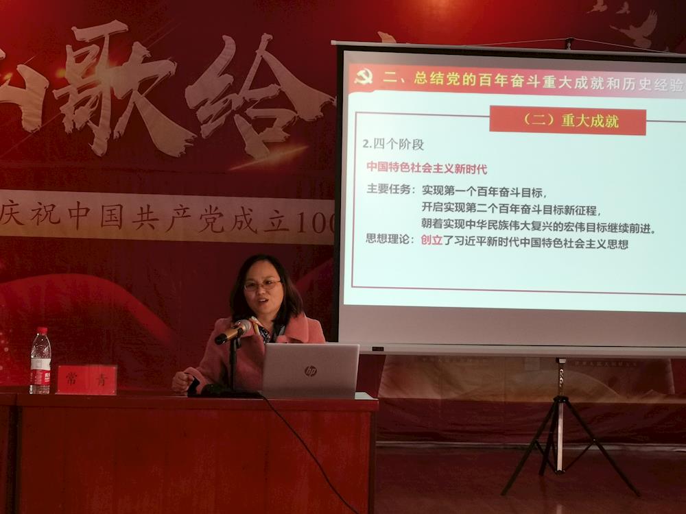 常青以《勿忘昨天 无愧今天 不负明天》为题,以扎实的理论功底,丰富的教学经验,概括了十九届六中全会的主要内容,同时系统的讲述了十九届六中全会以来中央政治局的主要工作,接着从背景条件、重大成就、历史经验、工作要求四个方面总结党的百年奋斗重大成就和历史经验,最后以对2022年中共二十大召开重要意义的展望结束了本次宣讲。
